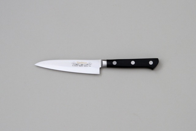 品番:13802 母材厚:2.0mm 刃渡:120mm 重量:75g MV口金牛刀シリーズは、錆に強く切れ味の持続性に優れた、当社オリジナルのステンレス鋼(MBS-26)を使用した、最高級のステンレス包丁の数々です。 手に伝わる重量感はプロの感覚そのままに、実用性を重視した本職用牛刀です。 刀身の材質:当社オリジナル ステンレス鋼(MBS-26) 材質詳細: カーボン 0.9%、クロム13%、モリブデン、バナジウム 口金: 一体型 硬度:HRC 58~59 中子形状: 本通し サブゼロ処理:あり ハンドルの材質:積層強化木