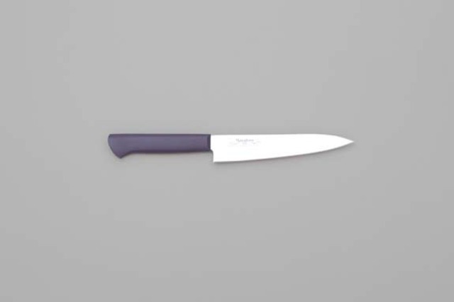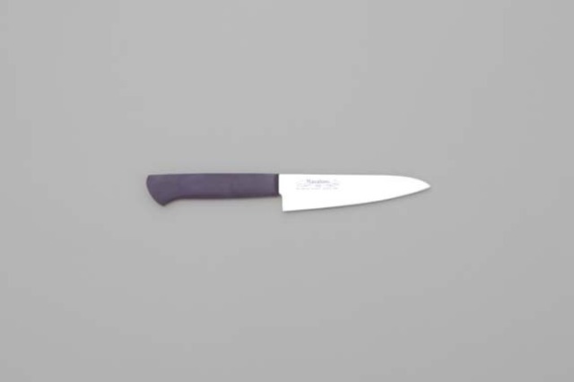 品番:13902、14502、14702、14402、14602、14302 母材厚:1.8mm 刃渡:120mm 重量:55g MVシリーズに衛生的なプラスチックハンドルを装着したシリーズ。 錆に強く、切れ味の持続性に優れたモリブデン・バナジウム鋼を使用。 木製ハンドル同様、手に伝わる重量感は実用性に耐久性をプラスした本職用牛刀です。 刀身の材質:当社オリジナル ステンレス鋼(MBS-26) 材質詳細: カーボン 0.9%、クロム13%、モリブデン、バナジウム 口金: なし 硬度:HRC 58~59 中子形状: 差し込み サブゼロ処理:あり ハンドルの材質:エラストマー樹脂(抗菌剤入) 【カラーバリエーション】 ハンドルカラーが 6色 ございます。(紫・黒・赤・緑・白・黄)