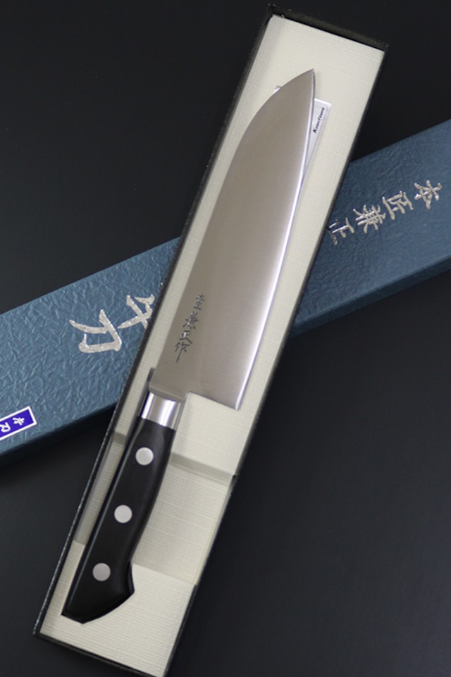 業務用包丁のロングセラー。研ぎやすく、鋭い切れ味を誇る全鋼包丁の最高峰シリーズ。使い込むほどに信頼感が増す包丁です。 ブレードはいわゆる「全鋼」で、炭素鋼の単層鋼(無垢材)です。ステンレス鋼ではありませんので、錆びやすいので注意が必要です。 HRC硬度61±0.5の高硬度SK-95(SK-4)を使用し、鋭い切れ味で本職用として高いパフォーマンスを発揮します。 飾り気のないシンプルで機能的なデザインで、信頼できるパートナーとなる包丁です。 中子形状は 本通し(ハンドル部全部=フルタング)で、口金は溶接されています。ハンドル材の黒合板は耐水性のある丈夫な材質で、しっかりと3か所でカシメられいます。まさにハードユースに耐えうる構造の業務用包丁です。 「三徳180mm」は非常に汎用性の広いスタイルで重宝します。 信頼の日本製、岐阜県関市産。 全長 約300mm 刃長 約180mm 刃厚 約2.0mm 重さ 約150g 鋼材 SK-95(SK-4)炭素鋼 柄材 黒合板 / 口金:ステンレス(溶接)