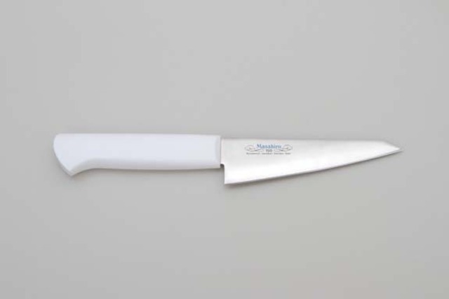 品番:14504 母材厚:1.8mm 刃渡:150mm 重量:60g MVシリーズに衛生的なプラスチックハンドルを装着したシリーズ。 錆に強く、切れ味の持続性に優れたモリブデン・バナジウム鋼を使用。 木製ハンドル同様、手に伝わる重量感は実用性に耐久性をプラスした本職用牛刀です。 MV-P牛刀シリーズは、錆に強く、切れ味の持続性に優れた当社オリジナルのステンレス鋼 (MBS-26)を使用しました。衛生的なエラストマー樹脂ハンドルを装着した、本職用牛刀です。 刀身の材質: 当社オリジナルのステンレス鋼 MBS-26使用 材質詳細: 0.9% カーボン・13% クロム・モリブデン・バナジウム 口金: 無し 硬度: ロックウェル硬さ HRc 58~59 中子形状: 差し込み型(ハンドル取付けは、樹脂の同時成型によって行う為、耐久性に優れています。) サブゼロ処理: 有り (液体窒素を使用し、-70℃で約30分保持しています。) ハンドル材質: ポリアミド エラストマー樹脂(抗菌剤入り) 耐熱温度-40℃~120℃