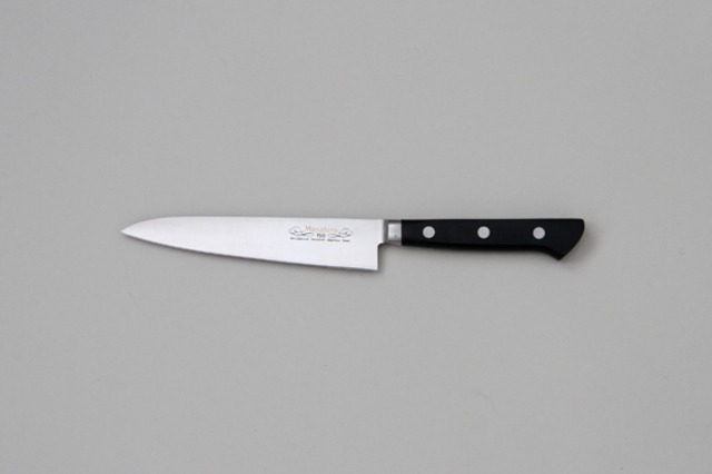 品番:13804 母材厚:2.0mm 刃渡:150mm 重量:95g MV口金牛刀シリーズは、錆に強く切れ味の持続性に優れた、当社オリジナルのステンレス鋼(MBS-26)を使用した、最高級のステンレス包丁の数々です。 手に伝わる重量感はプロの感覚そのままに、実用性を重視した本職用牛刀です。 刀身の材質:当社オリジナル ステンレス鋼(MBS-26) 材質詳細: カーボン 0.9%、クロム13%、モリブデン、バナジウム 口金: 一体型 硬度:HRC 58~59 中子形状: 本通し サブゼロ処理:あり ハンドルの材質:積層強化木