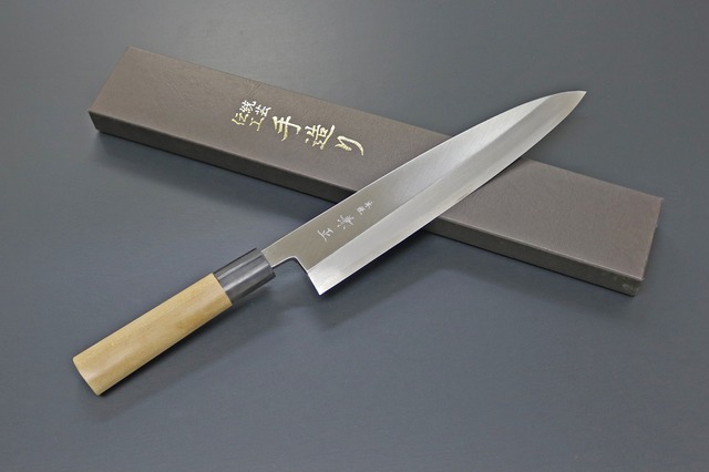 熟練職人による霞研ぎ、水牛口の品格 ●繊細な日本料理を支える高品質な和包丁 ●素材・材質:鋼材…日立安来鋼 白紙3号(鋼付)・柄材…朴の木、水牛口 全長:400mm 刃長:約240mm 刃厚:約4.5mm 重さ:270g