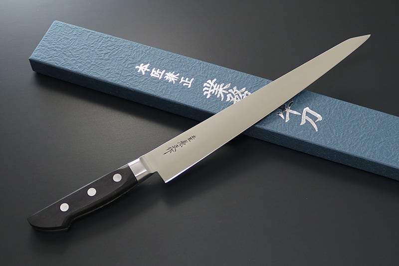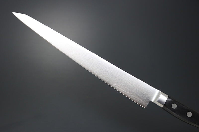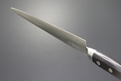 「筋引270mm」は、主に牛ヒレ肉の筋取りの際に細く長いブレードを生かして引き切りする際に適した特殊な形状のスタイルです。刺身の薄切りやカルパッチョなどの削ぎ切りにも適しています。