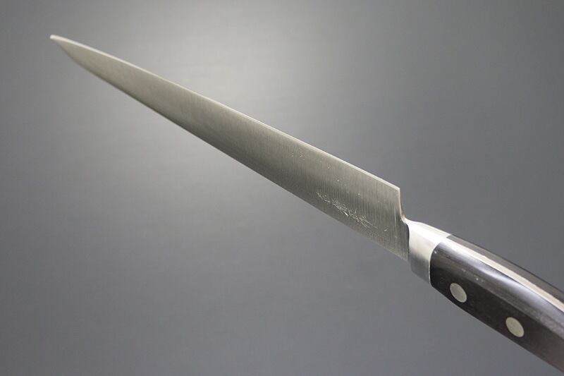 中子形状は 本通し(ハンドル部全部=フルタング)で、口金は溶接されています。ハンドル材の黒合板は耐水性のある丈夫な材質で、しっかりと3か所でカシメられいます。まさにハードユースに耐えうる構造の業務用包丁です。