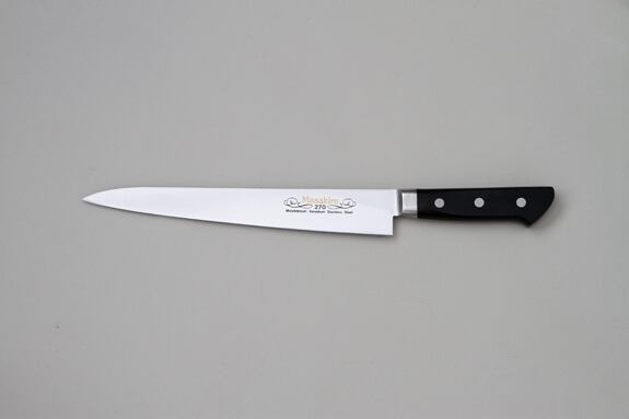 手に伝わる重量感はプロの感覚そのままに、実用性を重視した本職用牛刀です。