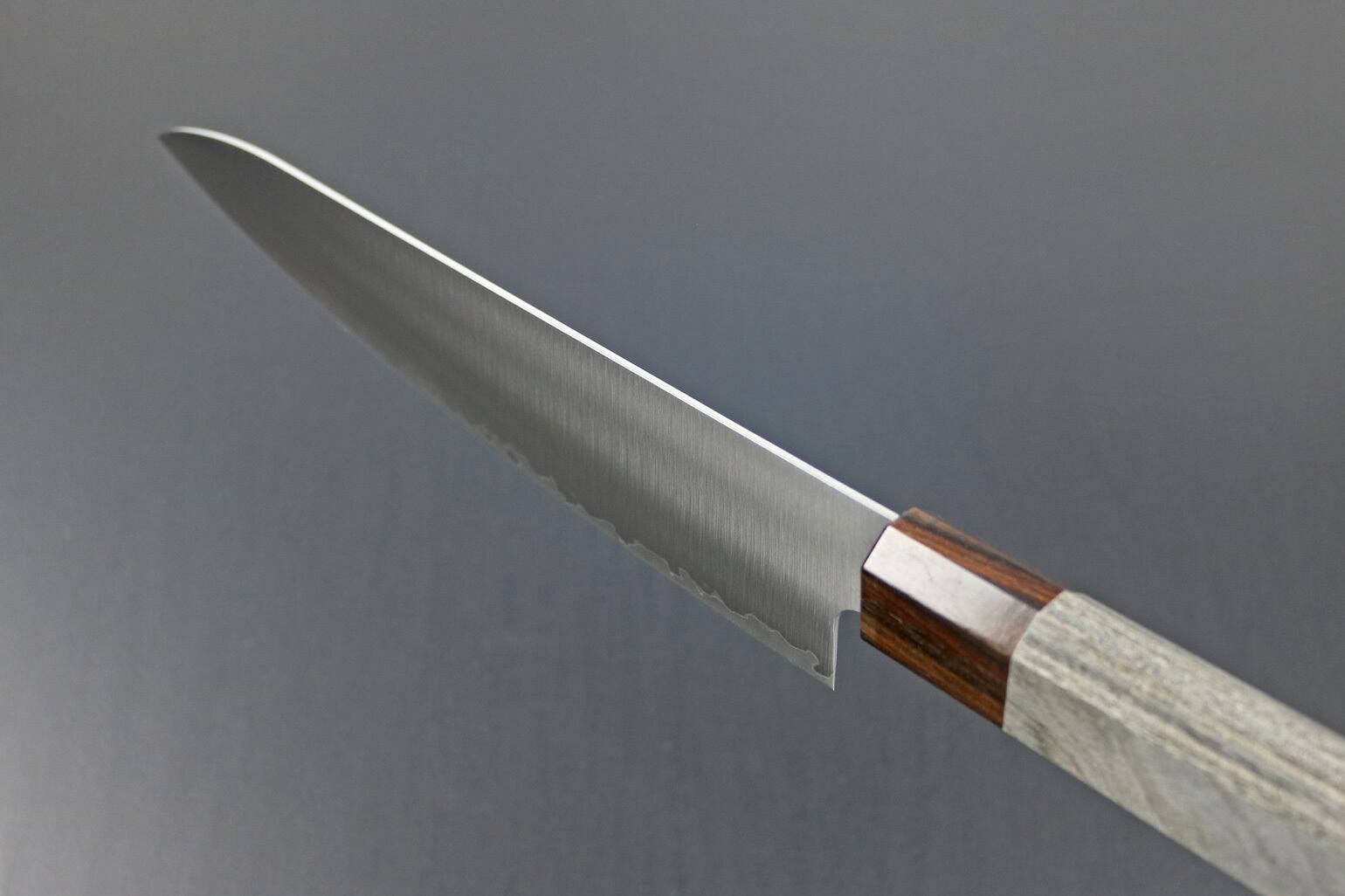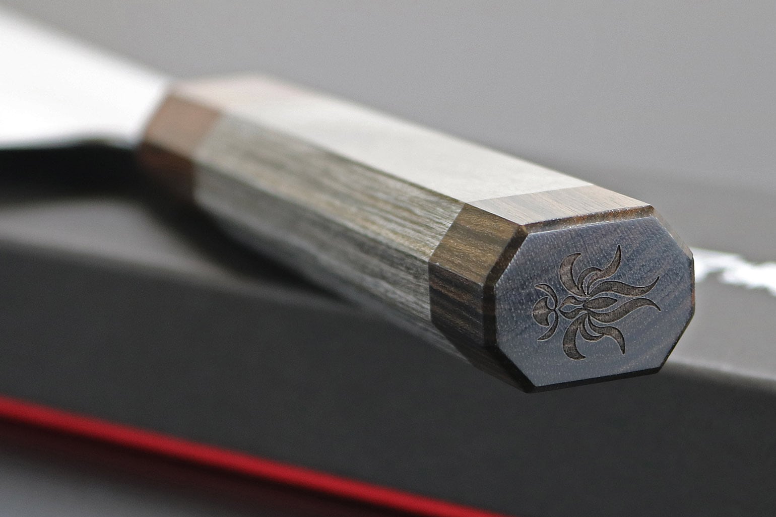 ハンドルはグレーの積層強化木と天然木の縞黒檀を両端にあしらった八角柄。精巧に加工されたこの上質な八角柄は、落ち着きのある控えめな配色で、丁寧に磨き上げられた艶やかさが素敵です。握った感触も心地よく、適度な重みで全体のバランスも良い。
