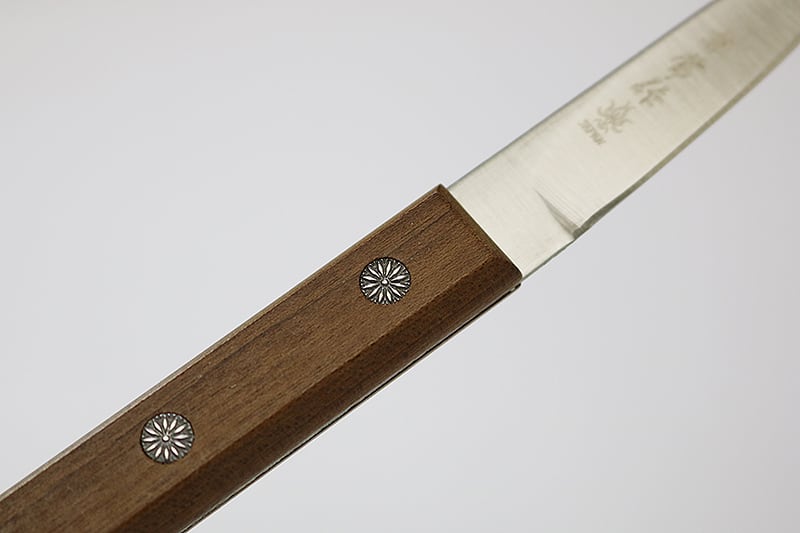 適度に鋭く尖った刃先、薄くシャープに研ぎあげられたハイカーボンステンレスAUS-8の本格的な切れ味。