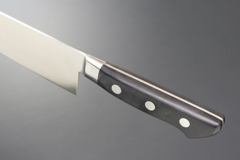 中子形状は 本通し(ハンドル部全部=フルタング)で、口金は溶接されています。ハンドル材の黒合板は耐水性のある丈夫な材質で、しっかりと3か所でカシメられいます。まさにハードユースに耐えうる構造の業務用包丁です。